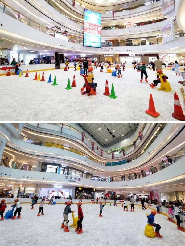 冰面采用人工制冰技术维持,设计上注重与商场现代、时尚的氛围融合。整体环境通透,常采用玻璃围挡,使冰场成为商场内的一个视觉焦点,滑冰者也能拥有开阔的视野。灯光设计通常会兼顾实用性与氛围营造,在特定时段可能配合音乐,打造轻松或动感的滑行体验。既能满足公众滑冰娱乐,也适合举办小型冰上活动。其设计现代,灯光绚丽,与商场内部的时尚氛围融为一体,透过周围的玻璃围栏,滑冰者可以俯瞰商场内的繁华景象。