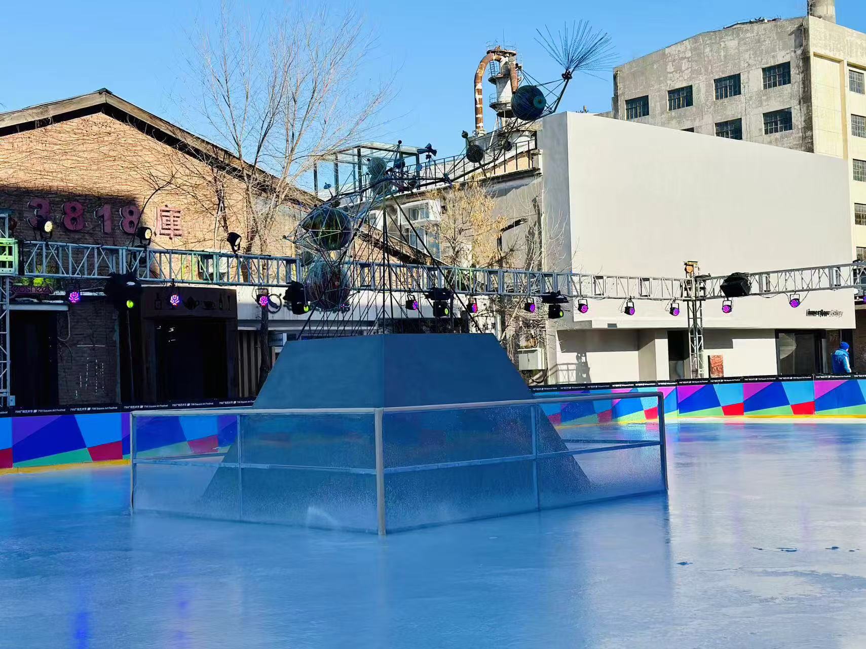 本冰场约为800平,是全天候户外冰场,舞美灯光音响、专业冰场制冷设备、围栏、管道、冰鞋护具头盔等设施、设备由上海古权电子科技有限公司提供和施工。