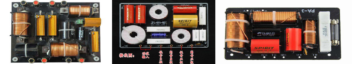 可以看出,分频器充分利用的电容器和线圈的特性达到分频。但是,线圈和电容器在各自阻碍的频率段内终究还是消耗了电压的,所以电路分频器会损失一定的声音,其补偿措施也有很多,由于笔者知识不够,难以说的很清楚。而电子分频就解决了这个问题,当声音输入到功放之前就先分频,然后对不同的频段使用专门的放大电路进行放大,这样的话声音失真小,还原逼真。但是电路复杂,造价昂贵。