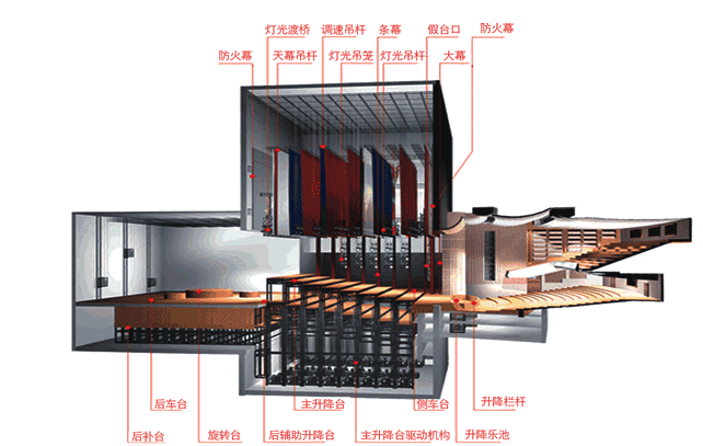 舞台机械包括:台上机械、台下机械、升降舞台、伸缩舞台、旋转舞台、活动假台口、灯光吊笼、灯光吊片、对开系统、舞台机械电影银幕架、升降系统、电动吊杆机、双出轴电动吊杆机、单出轴电动吊杆机、一次排绳滚筒式电动吊杆机、手电两用无级调速拉幕机、变频调速拉幕机、电动对开拉幕机;