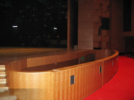 升降栏杆一般来说与升降乐池配合使用,升降栏杆设置在观众厅与升降乐池之间。当升降乐池上升至舞台面标高时,扩大了舞台表演区域。此时,升降栏杆降至观众厅地平面,看不到升降栏杆,当升降乐池下降至低于观众厅地平面以下,作乐池使用时,此时的升降栏杆上升1m高度,观众厅与升降乐池之间有一道栏杆,为保护观众跌入乐池。一般升降栏杆上部制作或有艺术感的透空结构,外观好看,乐声不能扩向观众。
