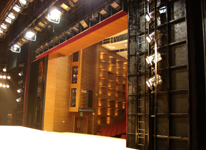 活动假台口采用型材制作,其两侧片(假台口)采用悬挂式(即侧片通过滚轮悬挂在前天桥下的轨道上,侧片可延轨道在台口方向运动,达到改变台口尺寸目的),其优点在于对舞台台面影响小,观察角大。渡桥提升采用曳引式驱动,安全保护性好,在电器失控的状态下能对设备起一定的保护。