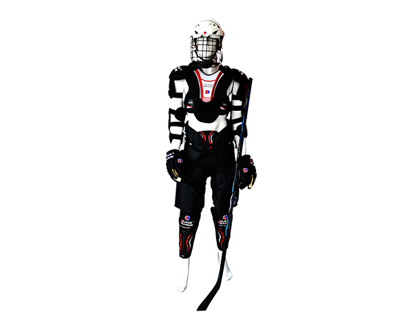 冰球运动员和裁判员装备。有头盔、护胸(护肩)、护肘、手套、护裆、裤叉、护腿和守门员头盔等。所有运动员必须戴冰球头盔,裁判员和边线裁判员亦可戴头盔。国际冰联批准的20岁或20岁以下的年龄组比赛,运动员必须戴全护面罩,其结构应能阻挡冰球或冰球杆刃的通过。